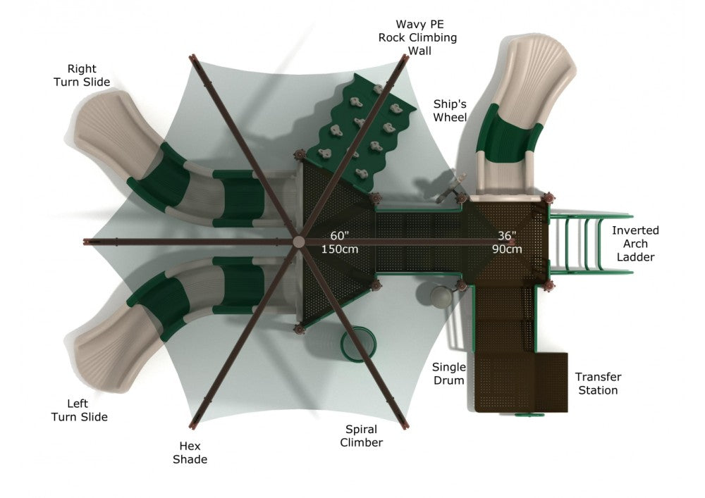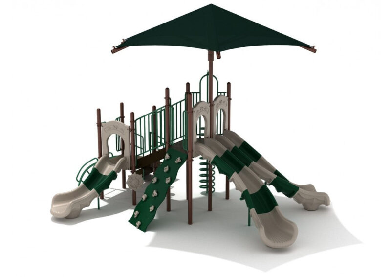 A large play structure with an impressive assortment of activities, Freedom Falls invites kids to play, even during the sweltering dog days of summer. Freedom Falls is far from an ordinary playground; among other features, it boasts a towering shade that effectively covers the majority of the structure and affords children the opportunity to rest in its shade. Shaded playgrounds are a great way to keep kids cool while at play, and Freedom Falls does just that. Upon approaching the structure, kids will notice the Ship’s Wheel and Single Drum, which allow for imaginative sensory play. The Spiral Climber and Rock Climbing Wall allow for easy ascent and descent to and from Freedom Falls, and the Right and Left Turn Slides offer a thrilling way to whoosh back down to the ground.